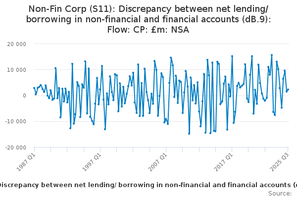 Download this time seriesNon-Fin Corp (S11): Discrepancy between net lending/ borrowing in non-financial and financial accounts (dB.9): Flow: CP: £m: NSA