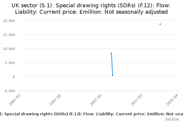 Download this time seriesUK sector (S.1): Special drawing rights (SDRs) (F.12): Flow: Liability: Current price: £million: Not seasonally adjusted