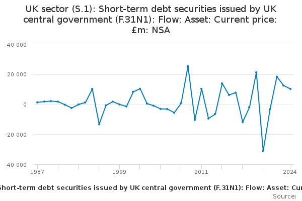 Download this time seriesUK sector (S.1): Short-term debt securities issued by UK central government (F.31N1): Flow: Asset: Current price: £m: NSA