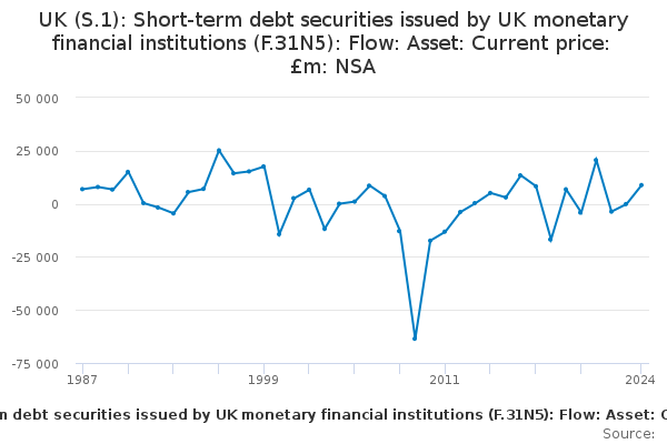 Download this time seriesUK (S.1): Short-term debt securities issued by UK monetary financial institutions (F.31N5): Flow: Asset: Current price: £m: NSA