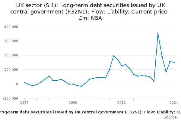Download this time seriesUK sector (S.1): Long-term debt securities issued by UK central government (F.32N1): Flow: Liability: Current price: £m: NSA