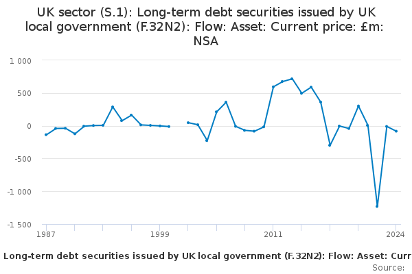 Download this time seriesUK sector (S.1): Long-term debt securities issued by UK local government (F.32N2): Flow: Asset: Current price: £m: NSA