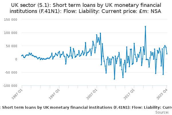 Download this time seriesUK sector (S.1): Short term loans by UK monetary financial institutions (F.41N1): Flow: Liability: Current price: £m: NSA