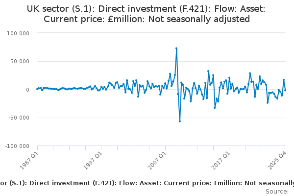 Download this time seriesUK sector (S.1): Direct investment (F.421): Flow: Asset: Current price: £million: Not seasonally adjusted
