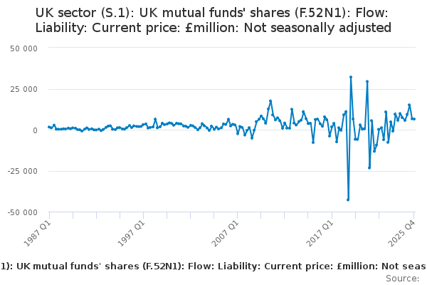 Download this time seriesUK sector (S.1): UK mutual funds' shares (F.52N1): Flow: Liability: Current price: £million: Not seasonally adjusted