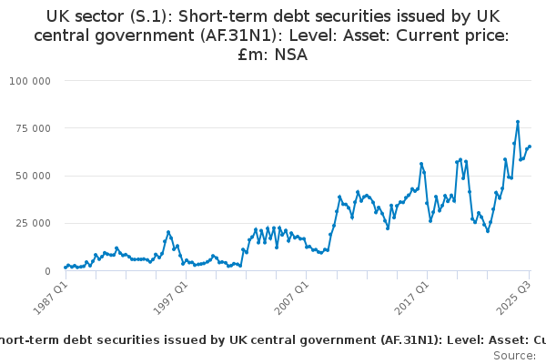 Download this time seriesUK sector (S.1): Short-term debt securities issued by UK central government (AF.31N1): Level: Asset: Current price: £m: NSA