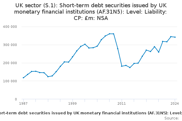 Download this time seriesUK sector (S.1): Short-term debt securities issued by UK monetary financial institutions (AF.31N5): Level: Liability: CP: £m: NSA