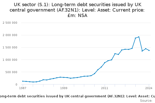 Download this time seriesUK sector (S.1): Long-term debt securities issued by UK central government (AF.32N1): Level: Asset: Current price: £m: NSA