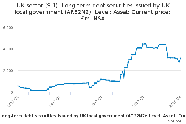 Download this time seriesUK sector (S.1): Long-term debt securities issued by UK local government (AF.32N2): Level: Asset: Current price: £m: NSA