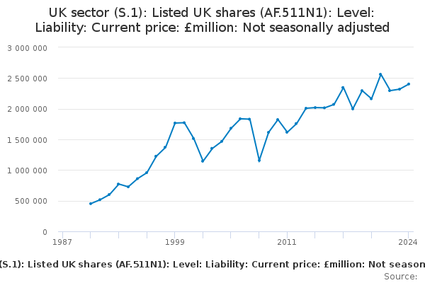 Download this time seriesUK sector (S.1): Listed UK shares (AF.511N1): Level: Liability: Current price: £million: Not seasonally adjusted