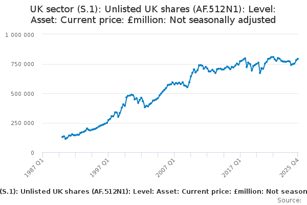 Download this time seriesUK sector (S.1): Unlisted UK shares (AF.512N1): Level: Asset: Current price: £million: Not seasonally adjusted