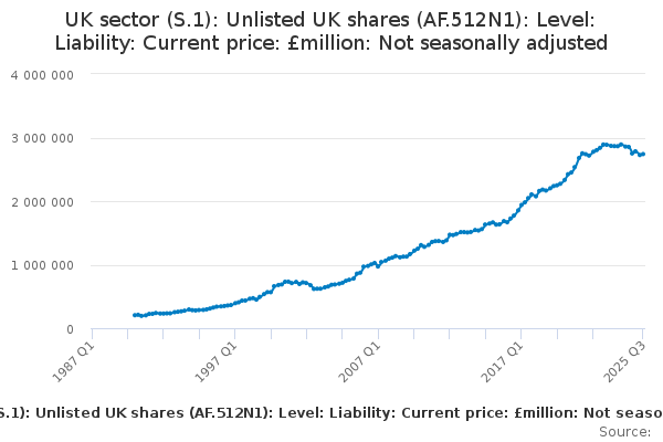 Download this time seriesUK sector (S.1): Unlisted UK shares (AF.512N1): Level: Liability: Current price: £million: Not seasonally adjusted