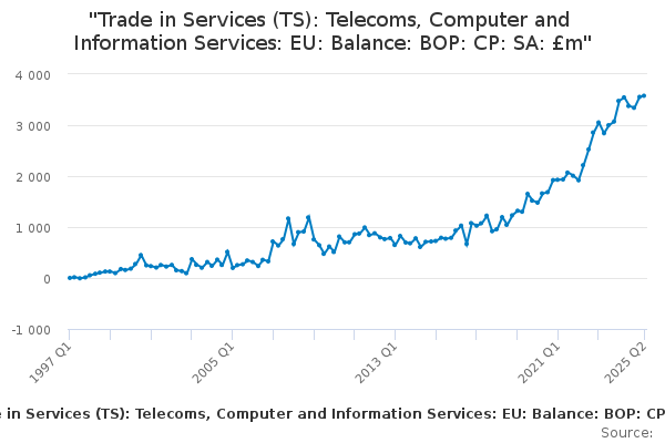 Download this time series"Trade in Services (TS): Telecoms, Computer and Information Services: EU: Balance: BOP: CP: SA: £m"