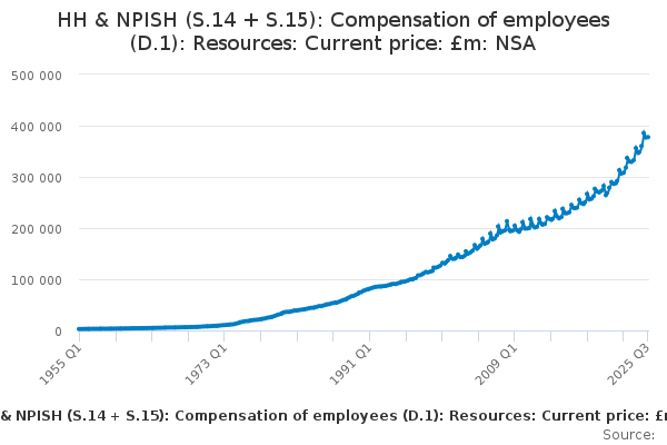 Download this time seriesHH & NPISH (S.14 + S.15): Compensation of employees (D.1): Resources: Current price: £m: NSA