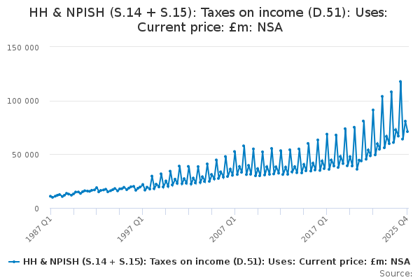 Download this time seriesHH & NPISH (S.14 + S.15): Taxes on income (D.51): Uses: Current price: £m: NSA