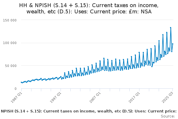 Download this time seriesHH & NPISH (S.14 + S.15): Current taxes on income, wealth, etc (D.5): Uses: Current price: £m: NSA