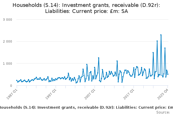 Download this time seriesHouseholds (S.14): Investment grants, receivable (D.92r): Liabilities: Current price: £m: SA
