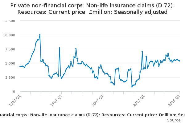 Download this time seriesPrivate non-financial corps: Non-life insurance claims (D.72): Resources: Current price: £million: Seasonally adjusted