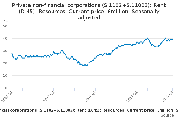 Download this time seriesPrivate non-financial corporations (S.1102+S.11003): Rent (D.45): Resources: Current price: £million: Seasonally adjusted