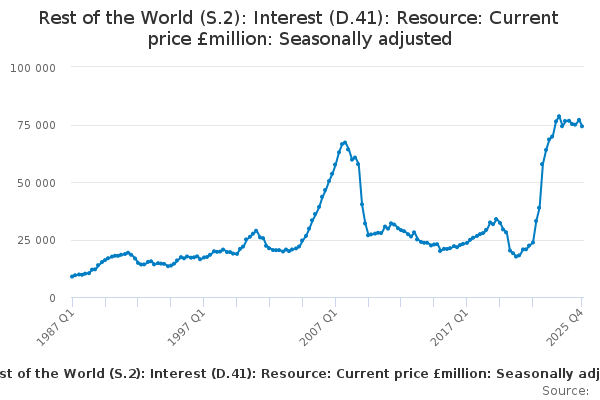 Download this time seriesRest of the World (S.2): Interest (D.41): Resource: Current price £million: Seasonally adjusted