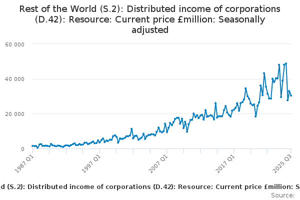 Download this time seriesRest of the World (S.2): Distributed income of corporations (D.42): Resource: Current price £million: Seasonally adjusted