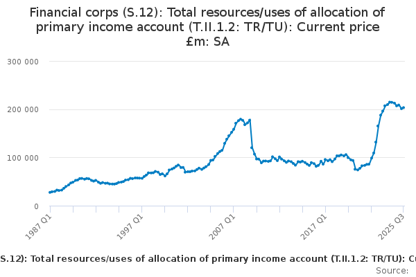 Download this time seriesFinancial corps (S.12): Total resources/uses of allocation of primary income account (T.II.1.2: TR/TU): Current price £m: SA