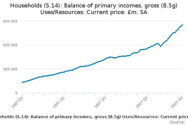Download this time seriesHouseholds (S.14): Balance of primary incomes, gross (B.5g) Uses/Resources: Current price: £m: SA