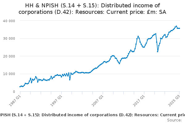 Download this time seriesHH & NPISH (S.14 + S.15): Distributed income of corporations (D.42): Resources: Current price: £m: SA