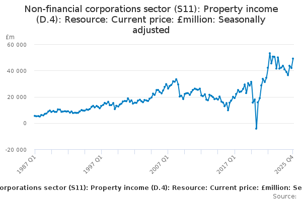 Download this time seriesNon-financial corporations sector (S11): Property income (D.4): Resource: Current price: £million: Seasonally adjusted