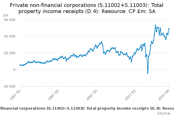 Download this time seriesPrivate non-financial corporations (S.11002+S.11003): Total property income receipts (D.4): Resource: CP £m: SA