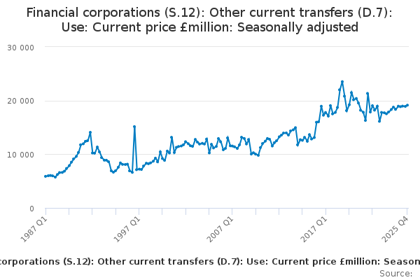 Download this time seriesFinancial corporations (S.12): Other current transfers (D.7): Use: Current price £million: Seasonally adjusted