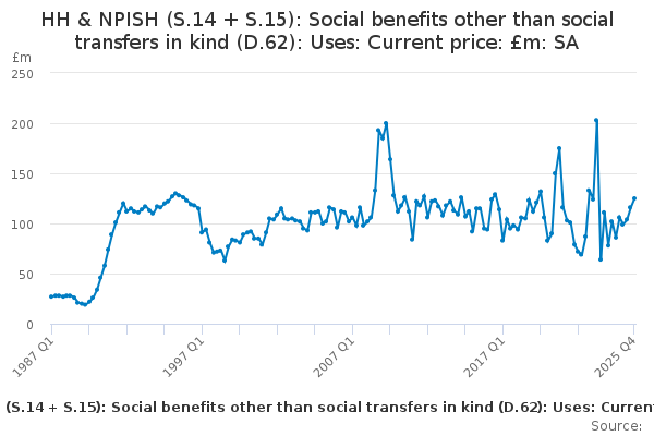 Download this time seriesHH & NPISH (S.14 + S.15): Social benefits other than social transfers in kind (D.62): Uses: Current price: £m: SA