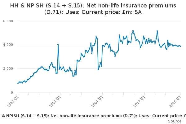 Download this time seriesHH & NPISH (S.14 + S.15): Net non-life insurance premiums (D.71): Uses: Current price: £m: SA