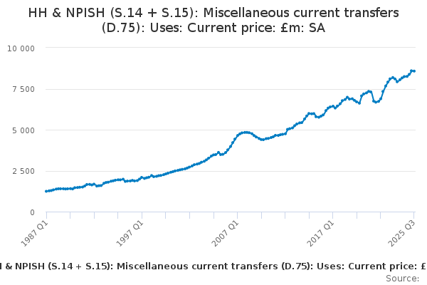 Download this time seriesHH & NPISH (S.14 + S.15): Miscellaneous current transfers (D.75): Uses: Current price: £m: SA