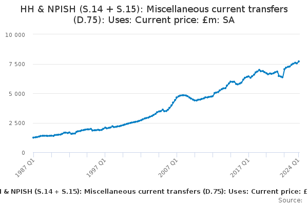 Download this time seriesHH & NPISH (S.14 + S.15): Miscellaneous current transfers (D.75): Uses: Current price: £m: SA