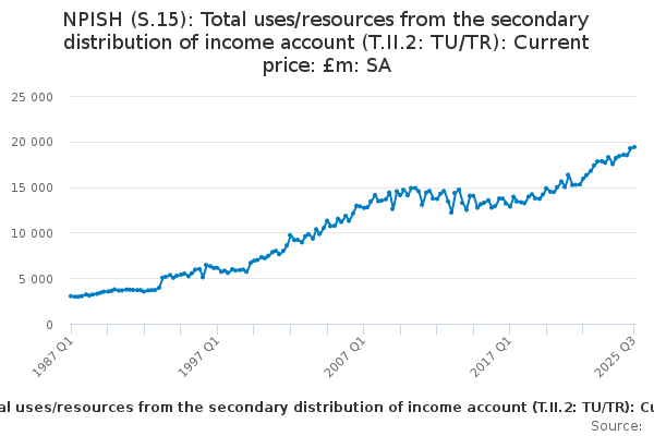 Download this time seriesNPISH (S.15): Total uses/resources from the secondary distribution of income account (T.II.2: TU/TR): Current price: £m: SA