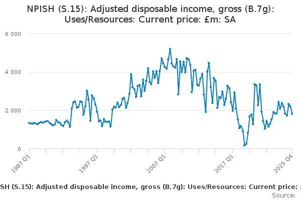 Download this time seriesNPISH (S.15): Adjusted disposable income, gross (B.7g): Uses/Resources: Current price: £m: SA