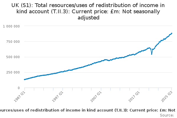 Download this time seriesUK (S1): Total resources/uses of redistribution of income in kind account (T.II.3): Current price: £m: Not seasonally adjusted