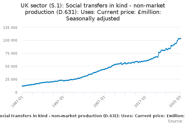 Download this time seriesUK sector (S.1): Social transfers in kind - non-market production (D.631): Uses: Current price: £million: Seasonally adjusted