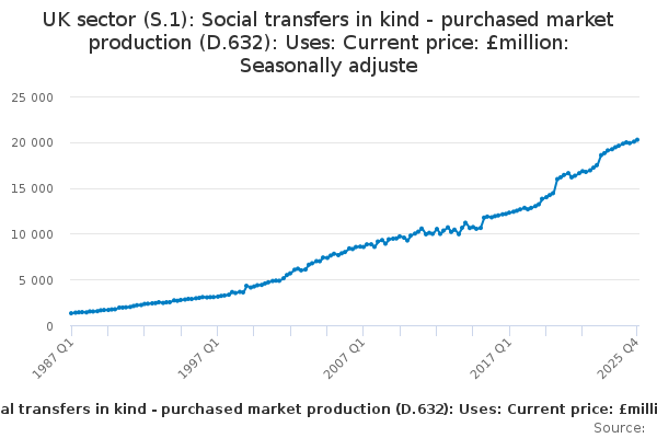Download this time seriesUK sector (S.1): Social transfers in kind - purchased market production (D.632): Uses: Current price: £million: Seasonally adjuste