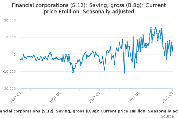 Download this time seriesFinancial corporations (S.12): Saving, gross (B.8g): Current price £million: Seasonally adjusted