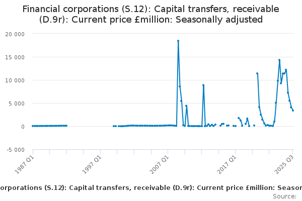 Download this time seriesFinancial corporations (S.12): Capital transfers, receivable (D.9r): Current price £million: Seasonally adjusted
