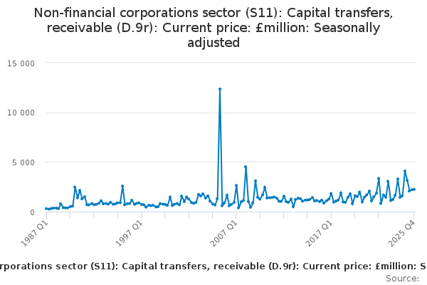 Download this time seriesNon-financial corporations sector (S11): Capital transfers, receivable (D.9r): Current price: £million: Seasonally adjusted