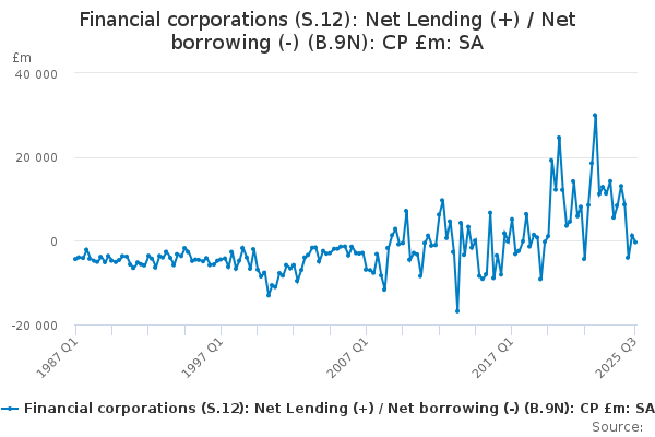 Download this time seriesFinancial corporations (S.12): Net Lending (+) / Net borrowing (-) (B.9N): CP £m: SA