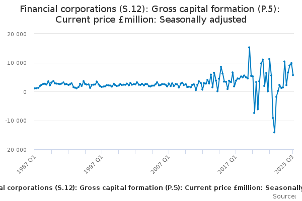 Download this time seriesFinancial corporations (S.12): Gross capital formation (P.5): Current price £million: Seasonally adjusted