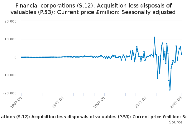 Download this time seriesFinancial corporations (S.12): Acquisition less disposals of valuables (P.53): Current price £million: Seasonally adjusted