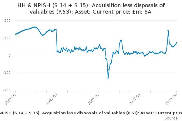 Download this time seriesHH & NPISH (S.14 + S.15): Acquisition less disposals of valuables (P.53): Asset: Current price: £m: SA