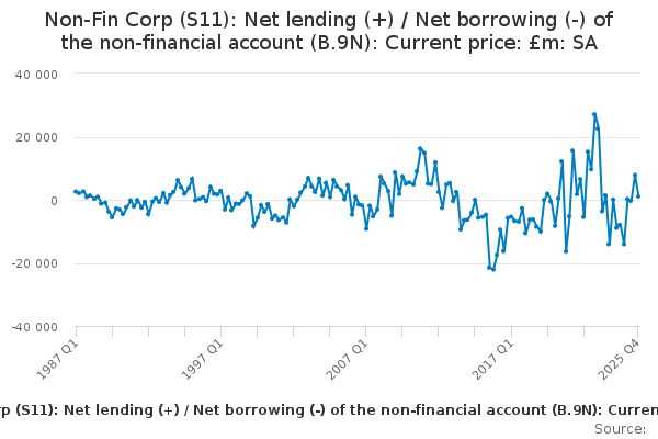 Download this time seriesNon-Fin Corp (S11): Net lending (+) / Net borrowing (-) of the non-financial account (B.9N): Current price: £m: SA
