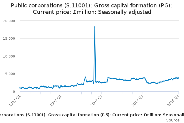 Download this time seriesPublic corporations (S.11001): Gross capital formation (P.5): Current price: £million: Seasonally adjusted