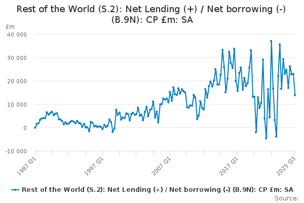 Download this time seriesRest of the World (S.2): Net Lending (+) / Net borrowing (-) (B.9N): CP £m: SA